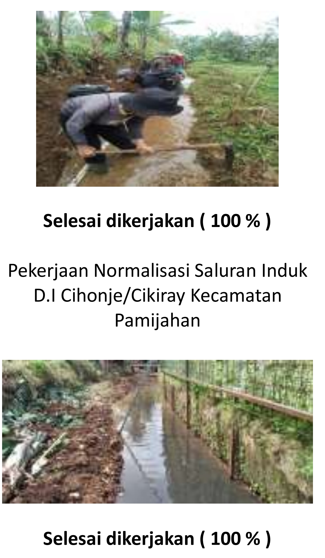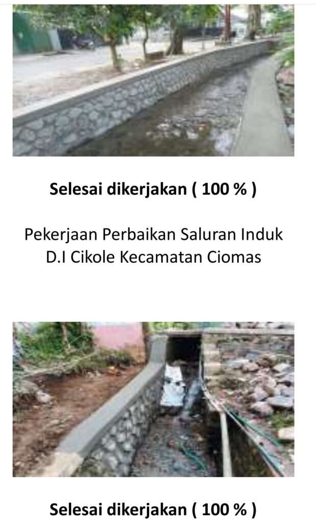 D.I Parigi Kecamatan Tenjolaya, Pekerjaan Normalisasi Saluran Induk D.I Jontor Kecamatan Tamansari, Pekerjaan Perbaikan Saluran Induk D.I Cikole Kecamatan Ciomas. Pekerjaan Perbaikan Saluran Induk