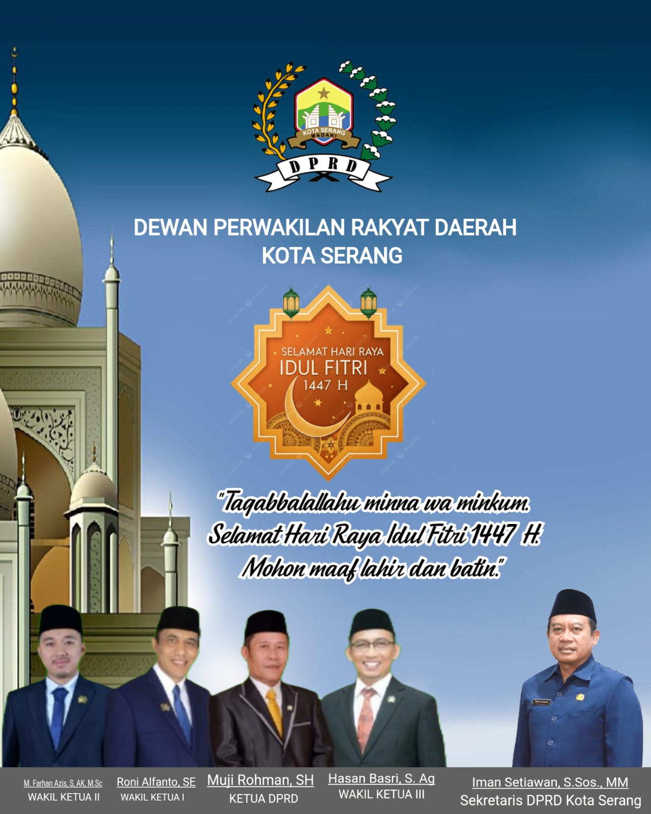 Taqabbalallahu minna wa minkum, taqabbal yaa kariim. Minal Aidin Wal Faizin Mohon Maaf Lahir dan Batin. Semoga Idul Fitri membawa keberkahan, mempererat persaudaraan, serta memperkuat semangat kebersamaan dalam membangun Kota Serang yang lebih maju dan sejahtera.